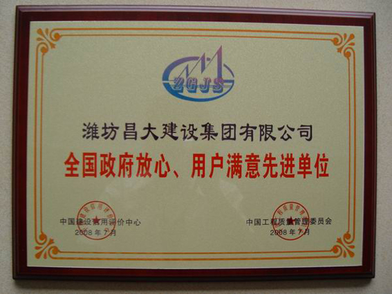 濰坊昌大建設集團被授予“全國政府放心、用戶滿意先進單位”榮譽稱號