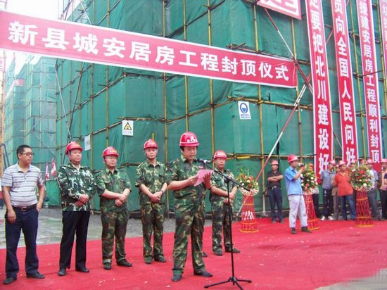9月25日上午11時(shí)20分,山東省援建新北川安居房工程舉行隆重的封頂儀式,儀式地點(diǎn)就設(shè)在集團(tuán)公司承建的工程施工現(xiàn)場。中央電視臺(tái)新聞?lì)l道在中午11時(shí)至12時(shí)的新聞直播段進(jìn)行了現(xiàn)場插播報(bào)道,“昌大建設(shè)”字號(hào)和援川人員多次在畫面中出現(xiàn)。集團(tuán)公司總經(jīng)理朱九洲參加了今天的封頂儀式并講話。今天封頂儀式現(xiàn)場下著大雨,援川人員在雨中舉行了這一慶奠。 根據(jù)指揮部的消息,第八分公司承擔(dān)的六棟安居房已于昨天(24日)全部封頂。