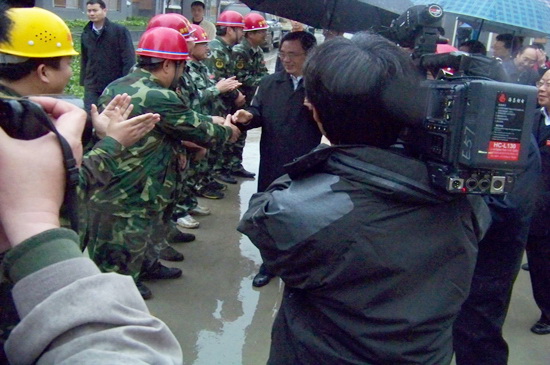 4月13日下午,春雨綿綿,中共中央政治局常委、中央紀(jì)律檢查委員會(huì)書(shū)記賀國(guó)強(qiáng)在有關(guān)人員陪同下,冒雨視察了北川新縣城援建工作。在集團(tuán)公司援建的溫泉一期安居房工程現(xiàn)場(chǎng),賀國(guó)強(qiáng)走進(jìn)住宅樓實(shí)地察看已經(jīng)建好的新居,非常高興,對(duì)山東省濰坊市援建的安居房工程給予很高的評(píng)價(jià),贊揚(yáng)山東省濰坊市的援建隊(duì)伍是一支能打硬仗的施工隊(duì)伍,他感謝在援建工作中作出辛苦努力的所有援建人員,并預(yù)祝圓滿(mǎn)完成援建任務(wù)。