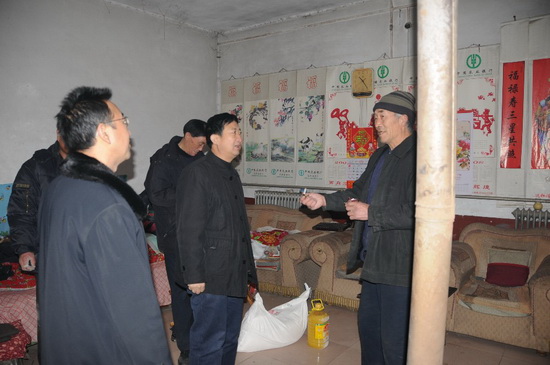1月18日上午,集團(tuán)公司監(jiān)事會(huì)主席、黨委副書記、紀(jì)委書記滕忠斌,副總經(jīng)理兼駐臨朐幫扶領(lǐng)導(dǎo)小組組長穆乃杰,在臨朐城關(guān)街辦有關(guān)領(lǐng)導(dǎo)及殷家河村兩委領(lǐng)導(dǎo)陪同下,走訪慰問幫扶村的革命家庭、長壽家庭、孤寡家庭及困難家庭等十個(gè)家庭戶代表,并送去面粉和食用油,表達(dá)集團(tuán)公司對幫扶村村民的新春祝福和美好祝愿。集團(tuán)公司總部有關(guān)部門、第九分公司有關(guān)人員和幫扶領(lǐng)導(dǎo)小組成員參加了走訪慰問活動(dòng)。 ![]() 走訪孤寡老人 ![]() 走訪革命家屬家庭 ![]() 走訪96歲壽星戶