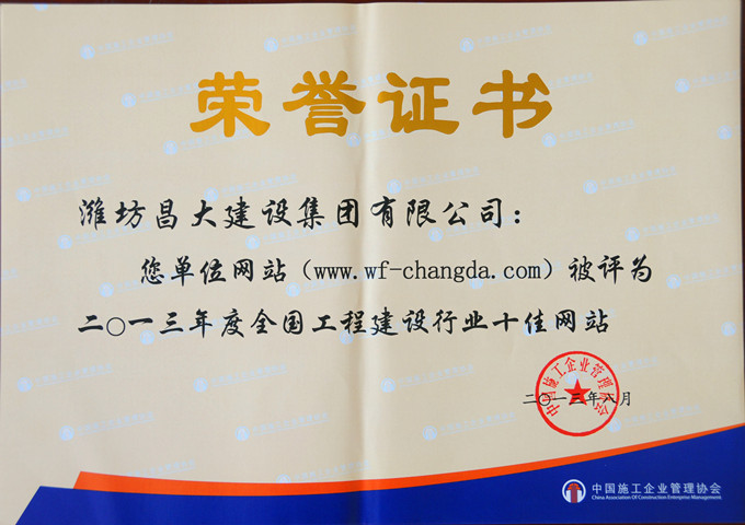 2013年8月15日至17日,中國(guó)施工企業(yè)管理協(xié)會(huì)召開(kāi)年度通聯(lián)員工作會(huì)議,報(bào)告通聯(lián)年度工作,開(kāi)展聯(lián)絡(luò)員通訊員交流活動(dòng),表彰優(yōu)秀報(bào)刊、網(wǎng)站,表彰優(yōu)秀聯(lián)絡(luò)員、通訊員。集團(tuán)公司官方網(wǎng)站(www.wf-changda.com)被評(píng)為2013年度全國(guó)工程建設(shè)行業(yè)十佳網(wǎng)站?!恫蠼ㄔO(shè)報(bào)》被評(píng)為全國(guó)工程建設(shè)行業(yè)銀頁(yè)報(bào)紙獎(jiǎng)。