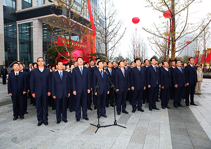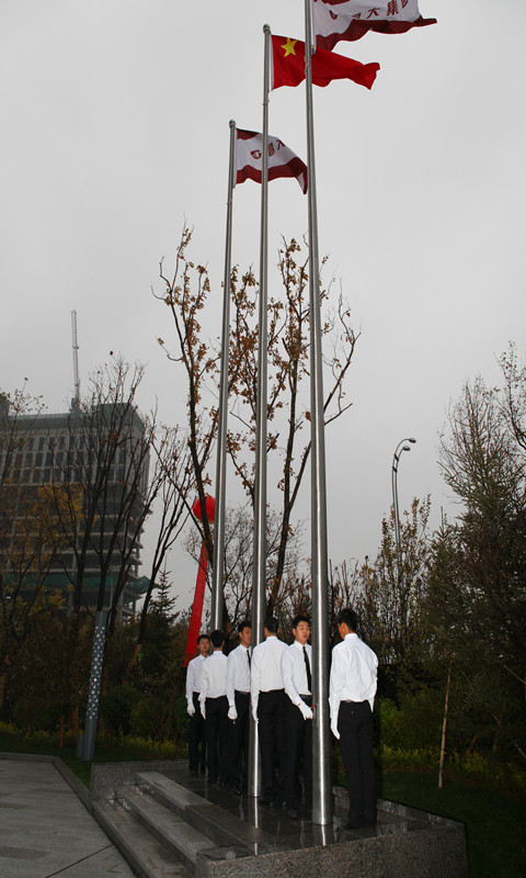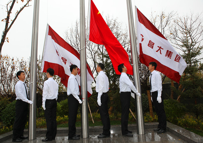 2013年11月9日早8時,集團在新辦公樓廣場升旗臺前隆重舉行了首次升國旗(企業(yè)司旗)儀式。 五星紅旗是中華人民共和國的標志和象征,五星紅旗作為中華民族五千年歷史上第一面代表全體人民意志的民族之旗、團結(jié)之旗、勝利之旗、希望之旗、吉祥之旗。舉行升旗儀式,就是昭示人們祖國的利益高于一切,要熱愛祖國。集團喬遷新辦公樓當天舉行升旗儀式,意義重大。 早7時50分,在集團新辦公樓辦公的集團高管層領(lǐng)導(dǎo)、集團總部及基層單位(子公司)全體員工300余人集結(jié)完畢,列隊站立,準備迎接升旗儀式。7時57分,6名護旗手邁著整齊的步伐走向升旗臺;8時整,隨著主持人一聲振奮人心的“奏國歌、升國旗”,伴隨著莊嚴的《中華人民共和國國歌》,鮮艷的五星紅旗在隨后升起的兩面昌大司旗映托下,在行注目禮的三百余雙眼睛注目中冉冉升起。昌大人在此時此刻用自己的方式表達了對祖國的敬意,也闡釋了對企業(yè)新的美好時代的向往和期盼。新的時代,昌大已經(jīng)走來,新的時代,昌大正快步向前!