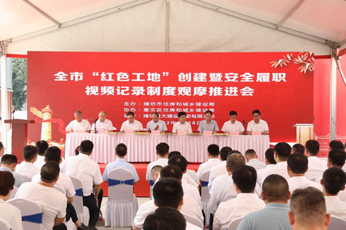2023年6月28日上午,全市“紅色工地”創(chuàng)建暨安全履職視頻記錄制度觀摩會在集團(tuán)四建公司總承包施工的濰坊市人民醫(yī)院內(nèi)科院區(qū)項目現(xiàn)場舉辦。山東省建設(shè)工程質(zhì)量安全中心主任王華杰,濰坊市住建局黨組書記、局長馬冰,濰坊市委組織部組織二科科長李連偉,濰坊市直機(jī)關(guān)工委組織部四級調(diào)研員李桂波,濰坊市住建局黨組成員、建筑業(yè)發(fā)展服務(wù)中心黨委書記、主任許增賢,濰坊市奎文區(qū)委常委、組織部長田學(xué)剛,濰坊市建筑業(yè)發(fā)展服務(wù)中心專職副書記、紀(jì)委書記彭玉剛,濰坊市奎文區(qū)住建局黨組書記、局長張文干等在主席臺就座;各縣市區(qū)、市屬有關(guān)開發(fā)區(qū)住建局代表、“紅色工地”創(chuàng)建工作先進(jìn)單位、優(yōu)秀班組、先進(jìn)個人及優(yōu)秀示范項目代表共100余人參加會議。集團(tuán)公司紀(jì)委書記穆乃杰受黨委書記、董事長徐鵬強委托出席會議致歡迎辭并作了題為《黨建引領(lǐng)方向、紅色鑄就經(jīng)典》的典型交流發(fā)言。