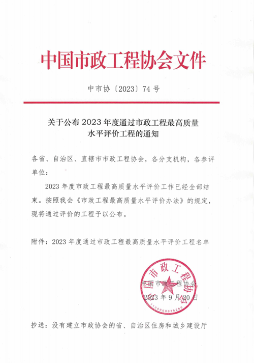 集團(tuán)榮獲2023年度市政工程最高質(zhì)量水平評價(jià)工程獎(jiǎng)