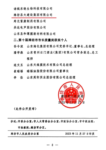 2023年11月27日,濰坊市人民政府公布了第十屆濰坊市市長質(zhì)量獎獲獎名單,根據(jù)《濰坊市市長質(zhì)量獎管理辦法》(濰政發(fā)〔2016〕14號),經(jīng)自愿申報、資格審查、受理公示、材料評審、現(xiàn)場評審、陳述答辯、擬獎公示等程序,集團公司榮獲第十屆濰坊市市長質(zhì)量獎。