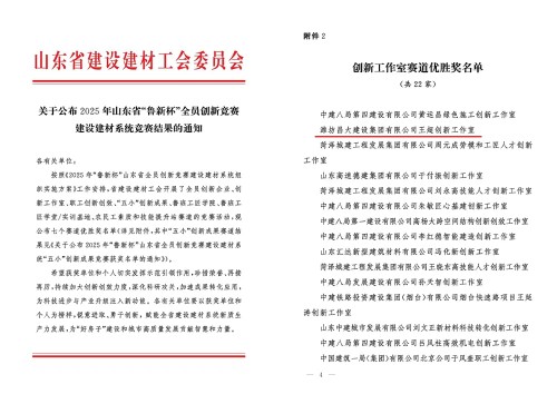 集團王超工匠創(chuàng)新工作室獲2025年山東省”魯新杯”全員創(chuàng)新競賽建設建材系統(tǒng)競賽優(yōu)勝獎