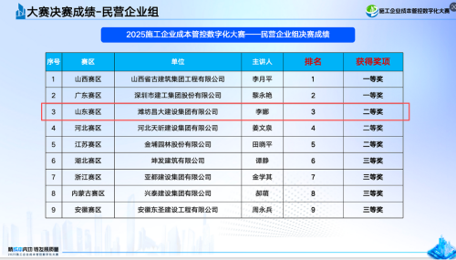 近日,備受建筑行業(yè)關(guān)注的“2025施工企業(yè)成本管控?cái)?shù)字化大賽總決賽暨頒獎(jiǎng)典禮”在北京圓滿落幕。集團(tuán)公司憑借扎實(shí)的成本數(shù)字化實(shí)踐成果,從全國(guó)近三千家參賽企業(yè)中脫穎而出,最終斬獲民營(yíng)企業(yè)整體排名第三、民營(yíng)企業(yè)組二等獎(jiǎng)的優(yōu)異成績(jī)。